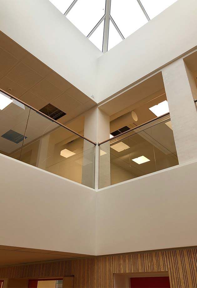 Glaspyramiden er placeret over et større opholdsområde med tilstødende gangarealer, og dermed er dagslys og frisk luft afgørende for trivslen og den daglige brug. Den nye glaspyramide er udført med VELUX glaspaneler, da det dermed er muligt at udskifte pyramiden til en ny energioptimeret løsning med samme udtryk og form.